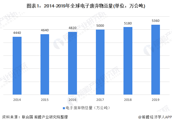 2014-2019年,全球電子廢棄物總量不斷增加。《2020年全球電子廢棄物監(jiān)測(cè)》報(bào)告顯示,2019年全球產(chǎn)生的電子廢棄物(帶電池或插頭的廢棄產(chǎn)品)總量達(dá)到了創(chuàng)紀(jì)錄的5360萬(wàn)公噸。